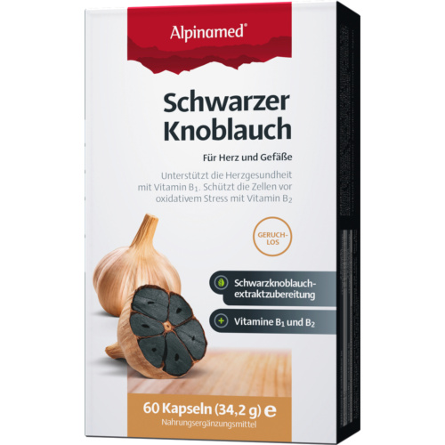 Alpinamed® Schwarzer Knoblauch ist in Kombination mit den Vitaminen B1 und B2 ein ideales Nahrungsergänzungsmittel, zur Unterstützung der Herzgesundheit