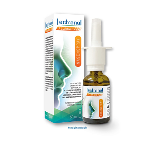 Lectranal® Allergie Nasenspray ist ein Medizinprodukt zur schnellen Linderung der Symptome bei allergischer Rhinitis, Rhinosinusitis und Sinusitis. Dank seiner Barrierewirkung beruhigt und hydratisiert Lectranal® Allergie Nasenspray die gereizte Nasenschleimhaut. Durch eine Schutzschicht schränkt es den Kontakt mit Allergenen (Pollen, Milben, Tierhaare, Staub) ein, wodurch die Hyperreaktivität reduziert wird. Die verflüssigende Wirkung hilft, die verstopfte Nase zu befreien, verbessert die Atmung und reinigt die Nasenhöhlen von Allergenen.