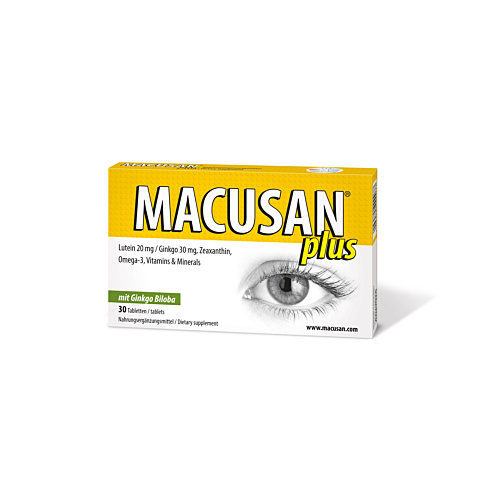 MACUSAN® plus ist ein Nahrungsergänzungsmittel mit antioxidativen Eigenschaften. Es enthält eine Vitalstoffkombination aus Vitaminen, Spurenelementen sowie einem Carotinoid (Lutein) und einem Pflanzenextrakt (Ginkgo).