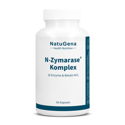 N-Zymarase® Komplex von NatuGena – Umfangreicher Komplex mit Enzymen und Betain. Der Komplex kombiniert 16 spezifisch ausgewählte Enzyme mit Betain HCl und natürlichem Bromelain und Papain. Der enthaltene Enzym-Mix deckt verschiedene Enzymklassen ab – darunter Proteasen, Lipasen, Cellulasen und Kohlenhydrat-spaltende Enzyme. Die Kombination eignet sich für alle, die eine möglichst breite enzymatische Unterstützung wünschen – in veganer, laktose- und glutenfreier Qualität. 90 Kapseln für eine 30-Tage-Versorgung.