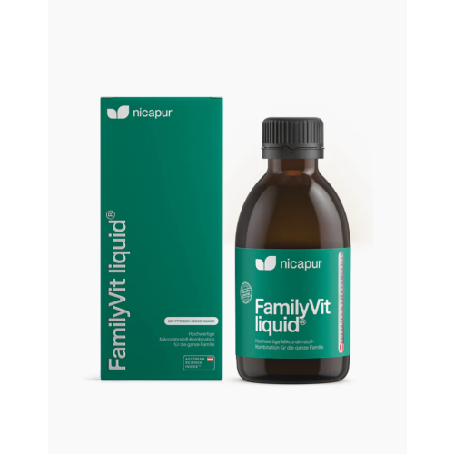 Die leckere Vitaminquelle FamilyVit liquid® unterstützt die tägliche Ernährung mit essentiellen Mikronährstoffen. Der einfach zu dosierende Saft mit fruchtig-leckerem Pfirsich-Geschmack bietet ein breites Spektrum an Vitaminen, Mineralstoffen und Spurenelementen für die ganze Familie und unterstützt so Wohlbefinden und Vitalität von Mama, Papa und Kids! Kombiniert mit Jod und extra Vitamin D3 bietet der Saft die tägliche Basisversorgung mit allen wichtigen Nährstoffen.