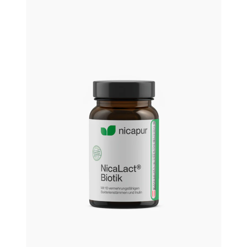 NicaLact® Biotik ist das Laktobakterienpräparat von NICApur®. Mit 10 definierten Stämmen und 6 Mrd. vermehrungsfähigen Einheiten pro Tagesdosis ist NicaLact® Biotik besonders hochkonzentriert, aktiv wirksam und für die Kurzzeit-Einnahme geeignet. Abgerundet wird die Kombination durch Inulin aus der Zichorienwurzel. In spezieller Kapselhülle mit zeitverzögerter Freisetzung (DR-Caps®) zur sicheren Magenpassage der Bakterienmischung. Verzehrhinweis bei gleichzeitiger Antibiotika-Einnahme: einen zeitlichen Abstand von mindestens 2 Stunden einhalten.
