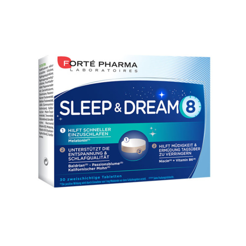 Sleep & Dream ist ein Nahrungsergänzungsmittel mit Melatonin, GABA, Niacin (Vitamin B3), Vitamin B6, Baldrian, Passionsblume und Kalifornischem Mohn.